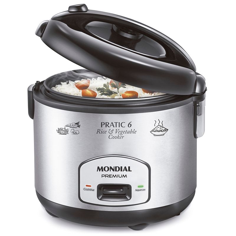Praticidade para preparar aquele almoço saboroso e saudável para toda a família com a Panela Elétrica Pratic Rice 6 da Mondial. Em aço inox, é multifuncional, tem 400W de potência e além de preparar um arroz soltinho e saboroso em poucos minutos, também cozinha sopas, carnes, legumes, verduras, risoto, arroz doce e muito mais. Com capacidade para até 6 xícaras, a família toda aproveita. Seu revestimento antiaderente facilita a limpeza, evitando que os alimentos grudem no interior. Com a válvula de saída de vapor, libera o excesso de vapor e garante um cozimento perfeito. Suas lâmpadas-piloto indicam o funcionamento da panela e o alimento fica aquecido por até 8 horas. Sua tampa basculante com travamento permite a utilização prática e segura do aparelho e seus acessórios como colher, copo medidor, cozi vapor que prepara verduras e legumes no vapor e um livro de receitas deixam a sua vida na cozinha mais fácil e divertida.